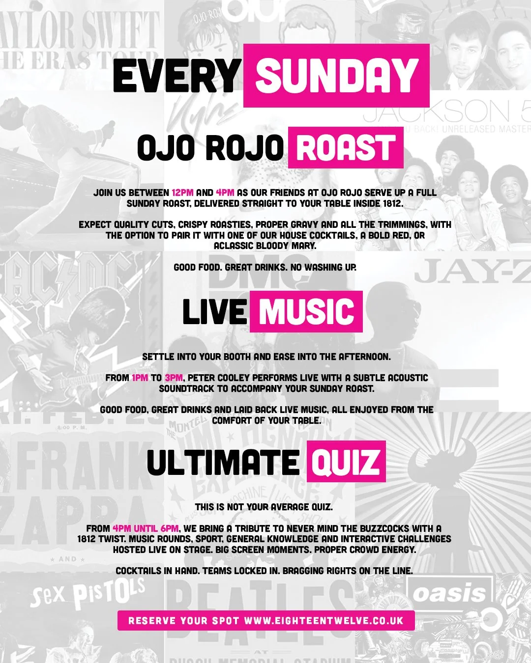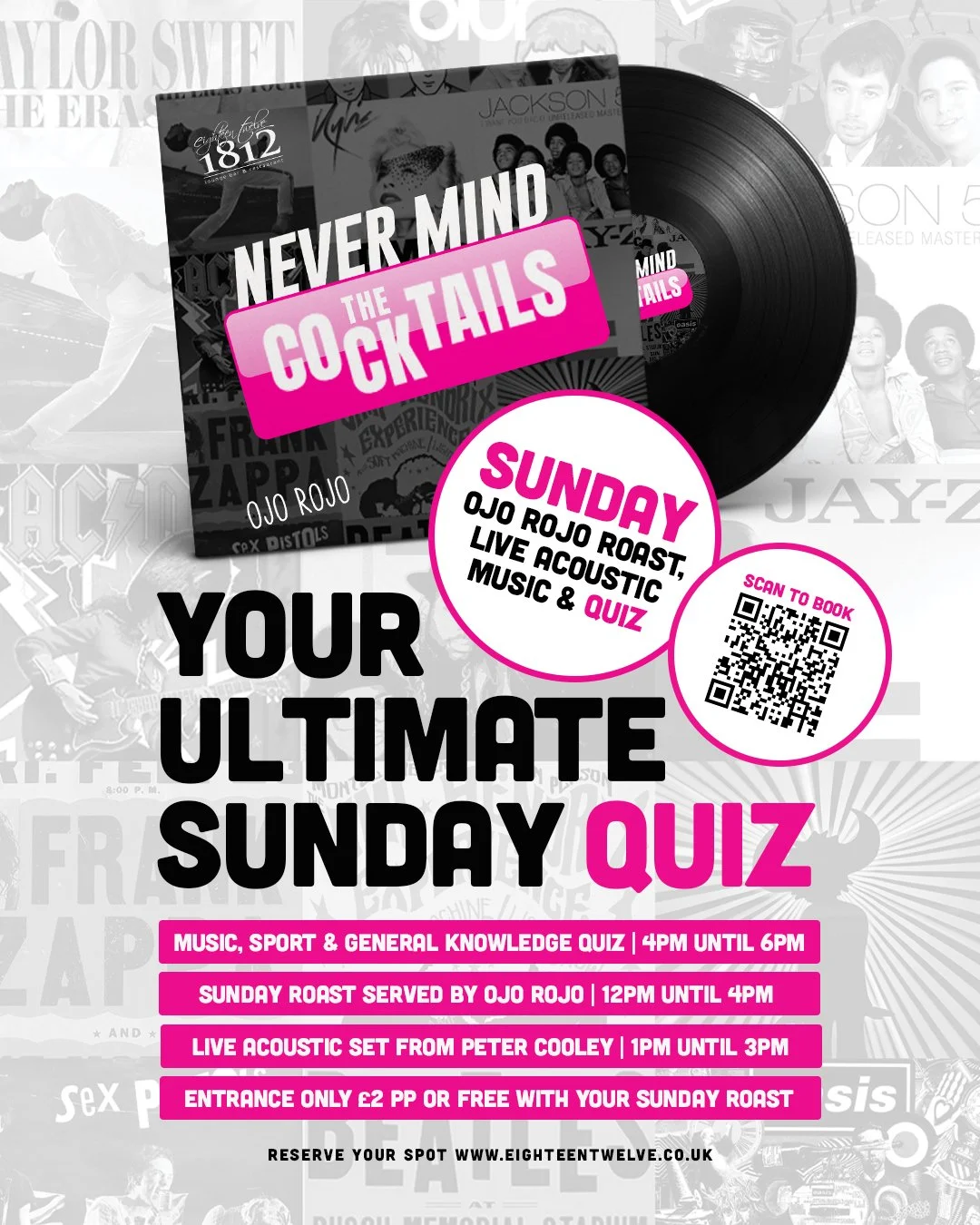 Welcome to the all new Ultimate Sunday Session under the disco ball at 1812 Cocktail Bar. Built for lovers of great music, proper food and competitive quizzing with a cocktail in hand.